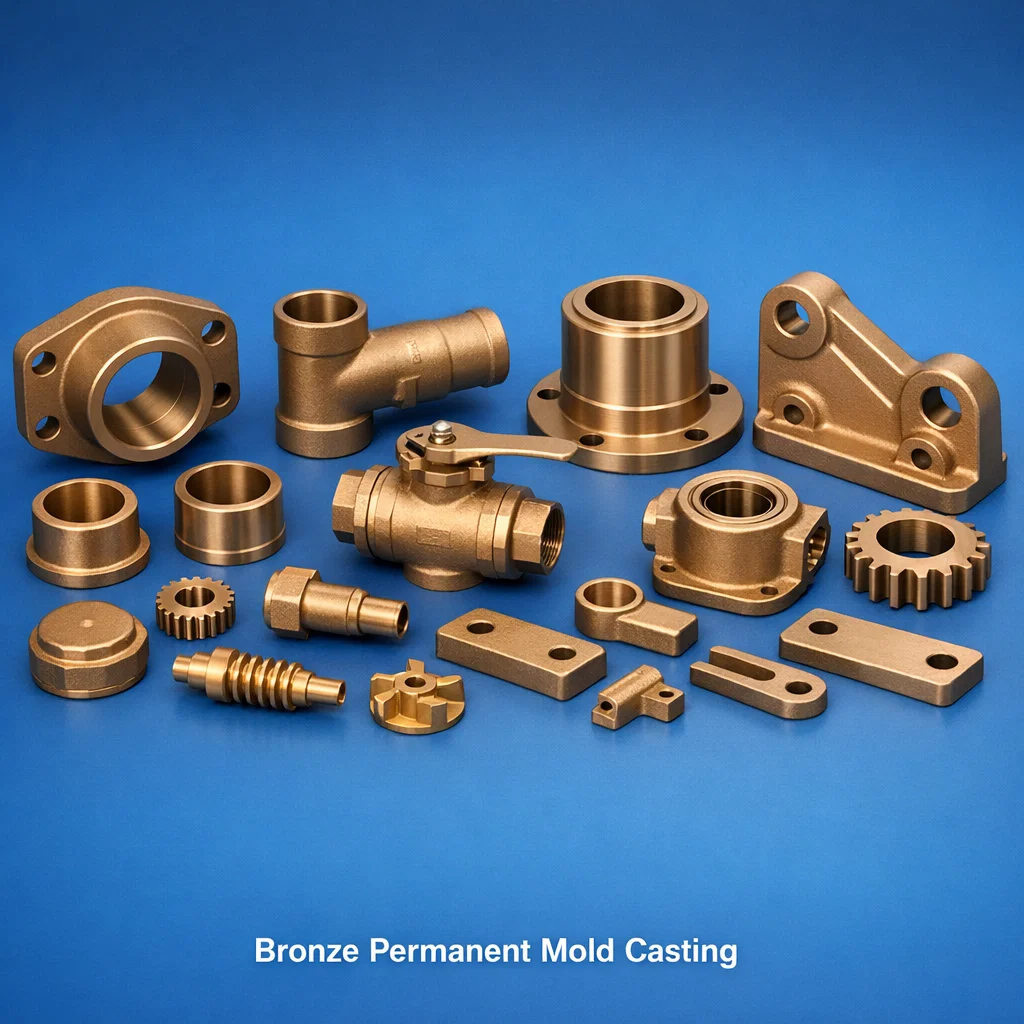 Bronze permanent mold casting uses reusable steel or cast iron dies to produce bronze components with superior dimensional accuracy, fine surface finish, and improved mechanical properties compared to sand casting, by leveraging the heat extraction and dimensional stability of the permanent metal mold. The process encompasses gravity die casting (GDC), low-pressure die casting (LPDC), and tilt-pour casting of bronze alloys including LG2 (C83600), phosphor bronze (C90500), aluminum bronze (C95400), tin bronze (G1), and lead-free tin bronze for bearing, valve, pump, marine, and precision engineering applications. Brass & Copper Parts operates bronze permanent mold casting facilities producing components from 0.05 kg to 10 kg, with production rates and quality levels intermediate between sand casting and investment casting, at tooling costs substantially below investment casting wax die tooling.