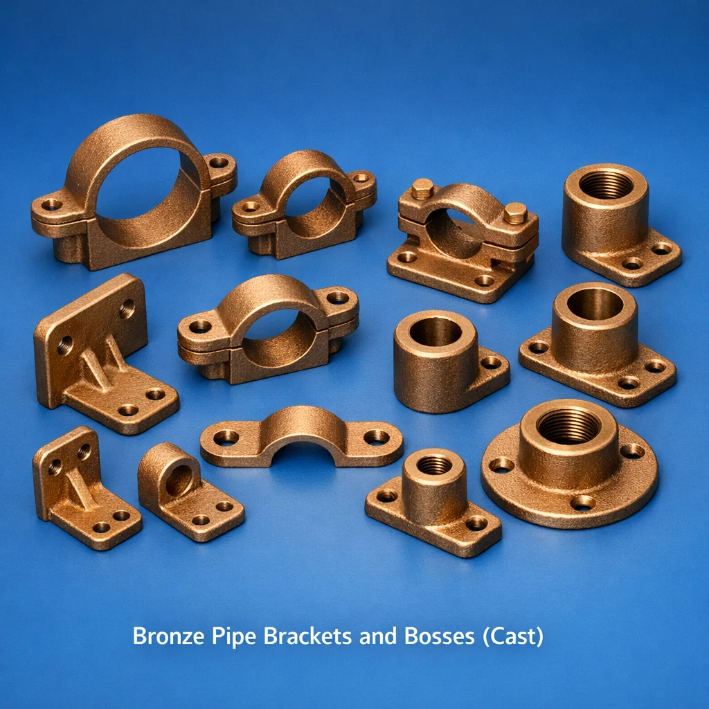 Cast bronze pipe brackets and bosses are structural pipe support and connection fittings manufactured from LG2 gunmetal (BS 1400 LG2 / ASTM B62) for marine, naval, and industrial pipe support systems where corrosion resistance, non-sparking properties, and structural integrity are required. Brass & Copper Parts India manufactures cast LG2 bronze pipe brackets (back-plates, pipe clips, saddle brackets) and pipe bosses (weld-on and bolt-on tapping connection bosses) to BS, DIN, and project-specific standards — supplying UK and USA naval architects, shipbuilders, offshore platform contractors, EPC construction firms, and industrial plant operators. Bronze pipe brackets are commonly specified in seawater service piping, naval vessel auxiliary systems, and fire protection piping where steel would corrode and brass would be inadequate in strength or dezincification resistance.