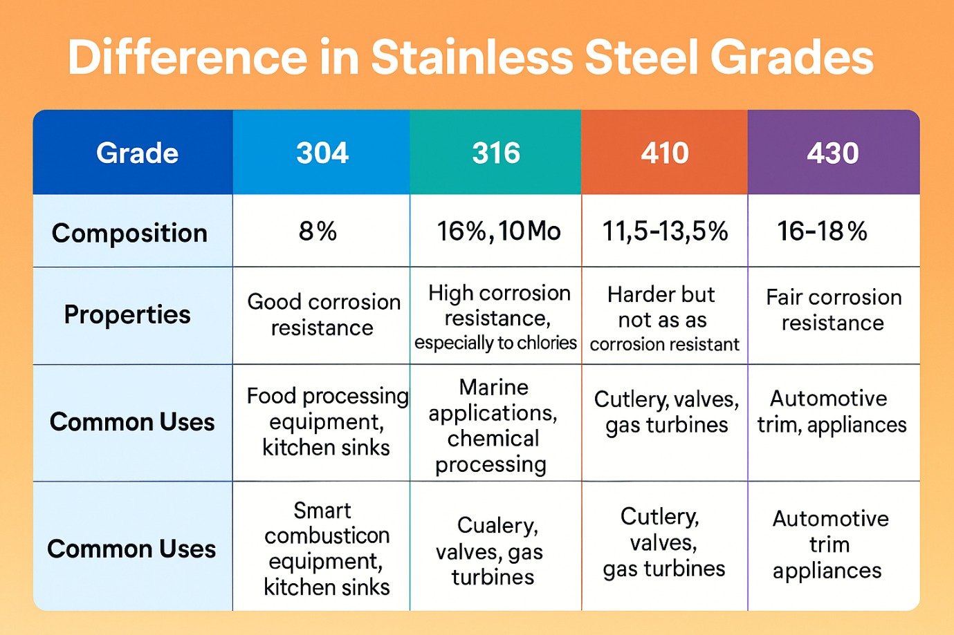 | 430 | S43000 | Cr: 16-18, C: ≤0.12 | General purpose, automotive trim, appliances |